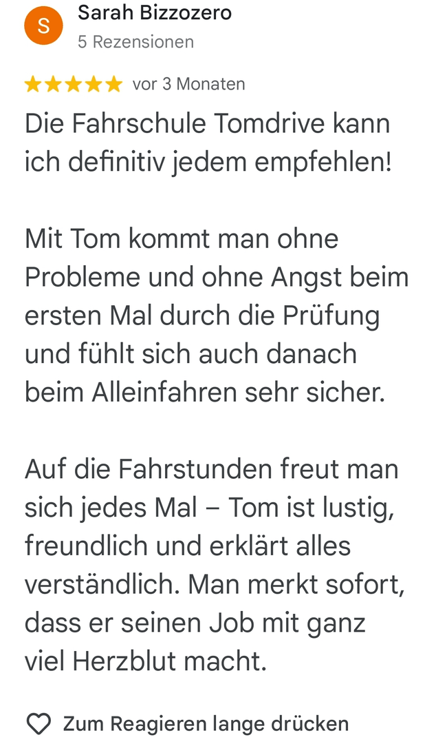 Du möchtest "Fahrschule tomdrive " bewerten und eine Rezension verfassen?